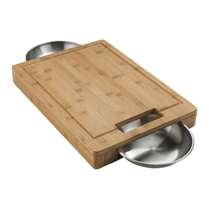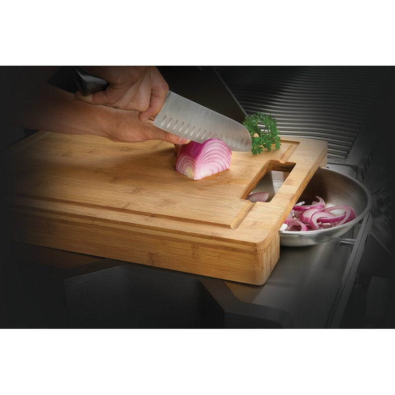 Das Schneidebrett und Schüsselset aus der PRO-Serie von Napoleon besteht aus einem haltbaren Bambus-Schneidebrett und zwei Edelstahlschüsseln. Das Schneidebrett von Napoleon verfügt über eine antibakterielle Oberfläche aus Bambus und eignet sich perfekt für die Zubereitung von Speisen für Ihren Grill. Die beiden Edelstahlschüsseln können seitlich unter das praktische Schneidebrett geschoben werden. Die Rille des Schneidebretts fängt Flüssigkeiten auf, die einfach über die Griffe von den Schüsseln aufgefangen werden können.