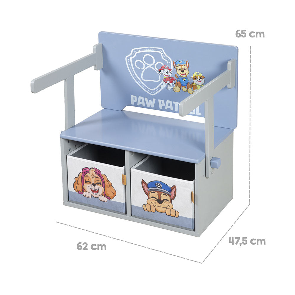 Die klappbare Sitzbank von roba im Paw Patrol Design bietet eine praktische Sitz- und Aufbewahrungslösung für Kinder. Zwei herausnehmbare Canvas-Boxen schaffen zusätzlichen Stauraum für Spielzeug. Die Bank besteht aus stabilem Holz und strapazierfähigem Stoff, hat abgerundete Ecken und eine kinderfreundliche Lackierung. Mit wenigen Handgriffen lässt sie sich in eine Sitzgruppe mit Tisch umwandeln, die sich zum Spielen, Malen oder Basteln eignet. Das farbenfrohe Design mit Chase, Marshall und Rubble macht sie besonders für Fans der Serie ansprechend., , , Produktinformationen, , 2 in 1 Sitzbank lässt sich in Sitzgarnitur mit Tisch umbauen, Zwei wendbare Canvas-Boxen (20 x 27 x 27 cm), Tischfläche 64 x 34 cm, Sitzbank 65.5 x 60 x 35 cm, Abgerundete Ecken und Kanten, Hautneutrale Lackierung, Geeignet für Kinder ab 18 Monaten