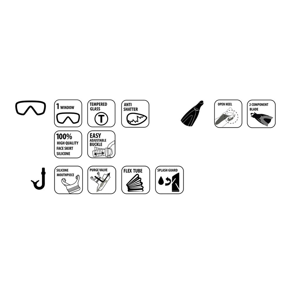 Produktinformation, , Schnorchel:, , Spritzwasserschutz (Semi-Dry Top), Mundstück aus Silikon, Ausblasventil, Flexibles Schnorchelteil, Verstellbarer Easy Clip Schnorchelhalter, Maske:, , Einzelglas, Sicherheitglas, Silikon-Maskenkörper und Silikon-Kopfband, Leicht einstellbares Schnallensystem zum Verstellen des Kopfbands, , Flossen:, , Flossen mit offenem Fussteil, Verstellbares Schnallensystem für mehrere Schuhgrössen (27 – 32), Anatomisch geformtes Fussteil, Walflossen Design, Reisefreundliches, kurzes Flossenblatt, Alles verpackt in Netztasche zum Transport und Trocknen