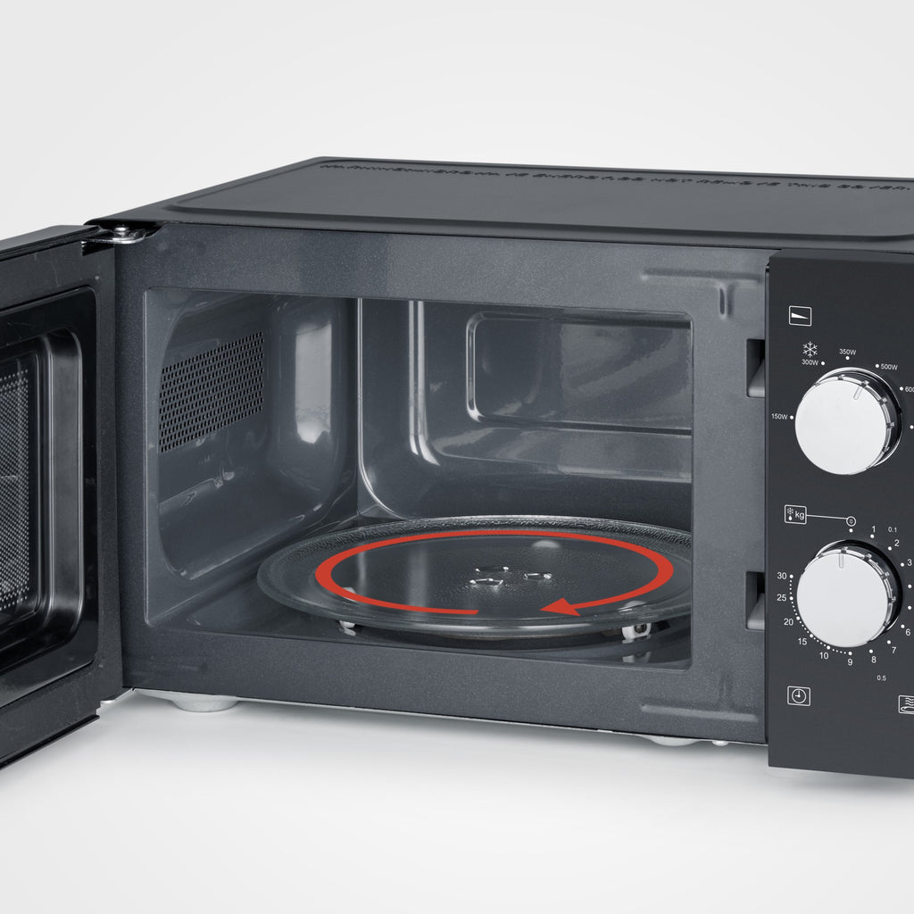 Der Handgriff und der Drehregler sind mit eleganten Chrom-Elementen verziert und verleihen der Mikrowelle ein modernes Design. Der praktische Drehteller mit einem Durchmesser von 24,5 cm ist einfach herausnehmbar und erleichtert die Reinigung.