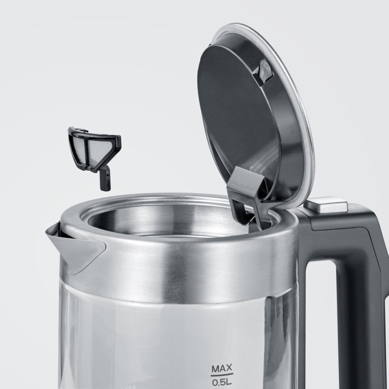 Dieser kompakte Mini Glas-Wasserkocher integriert sich stilvoll und modern in jede noch so kleine Küchenzeile. Mit 0,5 l Kapazität ist er extrem platzsparend und verhindert unnötiges Verschwenden von Wasser im Alltag. Dank Temperatureinstellungen von 40° - 100° C in 5° C-Schritten und wählbarer Warmhaltefunktion lässt sich jederzeit die perfekte Wassertemperatur für die verschiedensten Getränke einstellen. Durch die 1-Hand-Bedienung lässt sich der WK 3458 komfortabel bedienen – dank beidseitig bedruckter Wasserstandsanzeige ist er zudem perfekt für Rechts- und Linkshänder geeignet. Die hochwertige Kombination aus Glas und Edelstahl ist nicht nur optisch ein echter Hingucker, sondern garantiert durch die Verwendung von 100% BPA-freien Materialen auch einen unbedenklichen Genuss.