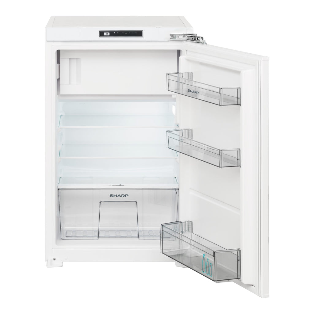 Der Sharp Einbaukühlschrank SJ-LD110E0XD-EU ist ein kompakter Kühlschrank mit Gefrierfach, der sich ideal für kleine Küchen und Einbaukonzepte eignet.