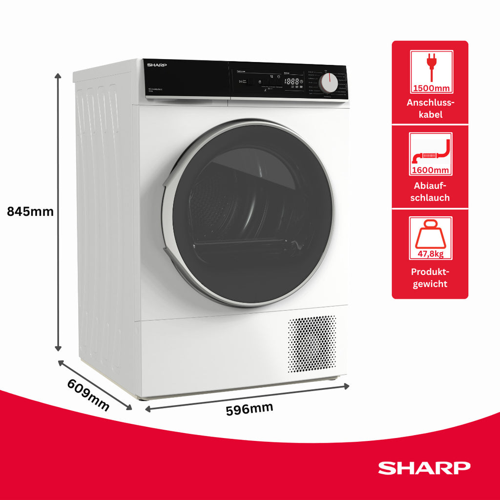 Der Sharp Wäschetrockner KD-NHA0S6GW1C bietet starke Trockenleistung, moderne Technik und hohen Bedienkomfort und ist ideal für Familien und Haushalte mit besonders hohem Wäscheaufkommen geeignet.