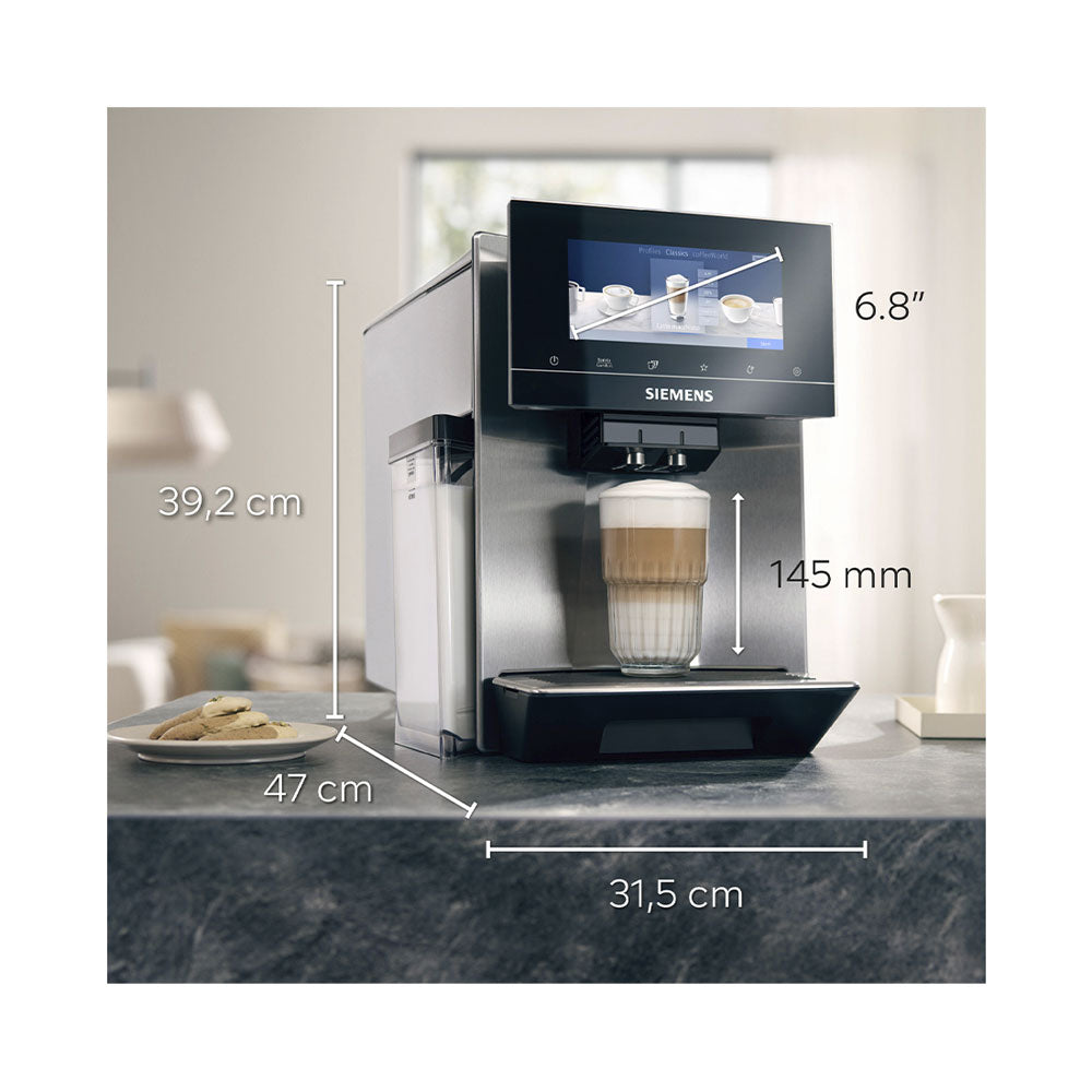 Der Siemens TQ903D03 Kaffee-Vollautomat EQ900 bietet Genuss auf höchstem Niveau. Mit dem baristaMode lässt sich der Kaffee individuell anpassen – von Stärke bis Temperatur. Das iSelect Display mit 6,8 Zoll Full-Touch ermöglicht eine kinderleichte und intuitive Bedienung. Dank superSilent wird der Kaffee in Ruhe genossen, ohne störende Geräusche. Die Home Connect-Funktion eröffnet vielfältige Möglichkeiten: Die coffeeWorld kann erkundet oder eine coffeePlaylist bequem per App erstellt werden. Der integrierte Tassenwärmer sorgt für perfekt temperierte Tassen – für verbessertes Aroma und längeren Kaffeegenuss. Perfektion in jedem Detail – der EQ900.