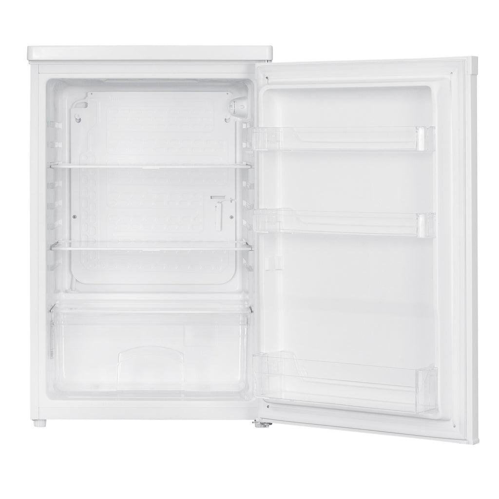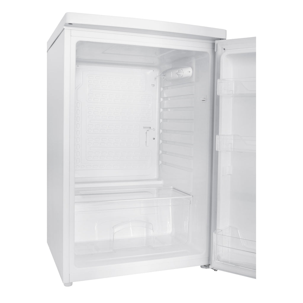 Der Temperaturbereich des Kühlschranks liegt zwischen 0 und 10 Grad Celsius und wird über eine mechanische Steuerung geregelt. Eine Beleuchtung sorgt dafür, dass die Lebensmittel immer gut sichtbar sind. Die gehärteten Glasregale bieten ausreichend Stauraum und sind leicht zu reinigen. Eine Gemüseschublade und eine abnehmbare obere Kunststoffabdeckung runden das Angebot ab.