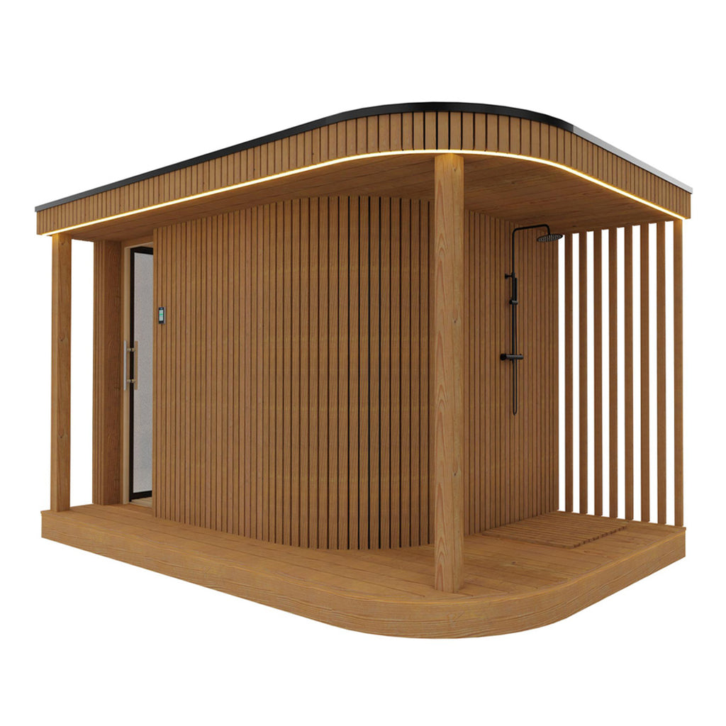Auf der großzügigen Terrasse des Gebäudes befindet sich eine erfrischende Dusche, die sich ideal für eine Abkühlung nach einem heißen Saunagang eignet. Die stromlinienförmige Form des Hauses wird durch eine Leiste mit warmem Licht unterstrichen, die über das Dach verläuft und für eine stimmungsvolle Beleuchtung im Außenbereich sorgt. Entdecken Sie mit der Gartensauna Alto eine neue Dimension der Entspannung und genießen Sie luxuriöse Wellness-Momente direkt vor Ihrer Haustür.