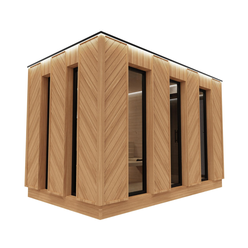 Die Gartensauna Berg ist ein architektonisches Meisterwerk, das modernes Design mit skandinavischem Stil vereint. Die Fassade des Saunahauses ist mit Fischgrätpaneelen aus hellem Holz verkleidet, was ihm einen einladenden und zugleich zeitgemäßen Look verleiht.
