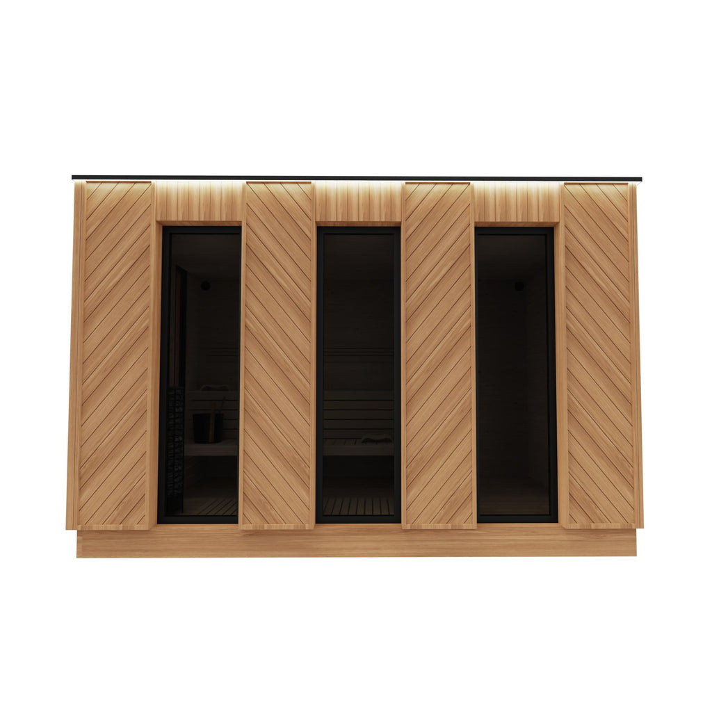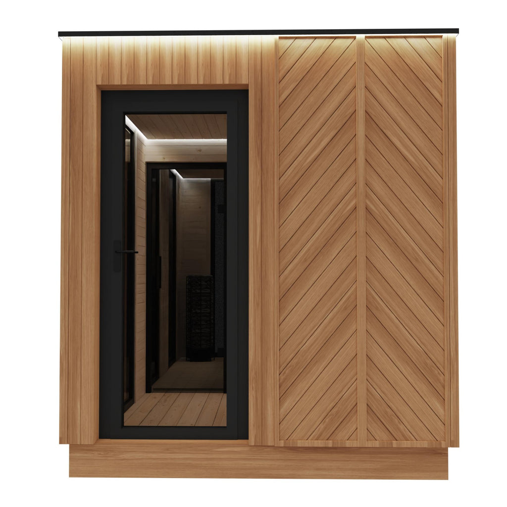 Die Gartensauna Berg wird mit LED-Leisten beleuchtet, die sowohl innen als auch außen für eine stimmungsvolle Atmosphäre sorgen. Die Leisten sind um das Dach herum und in der abgehängten Decke, hinter der Rückenlehne und unter der Sitzbank angebracht, und betonen das moderne Design des Saunahauses..
