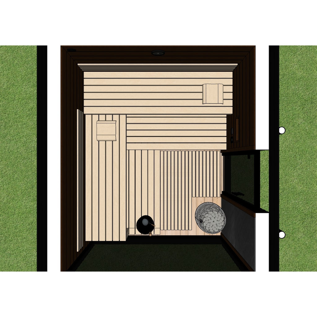 Die Gartensauna Bjorn überzeugt mit ihrem charmanten Design und hochwertigen Materialien. Die Fassade aus diagonalen Plankenprofilen und das dunkle Abachi-Thermoholz im Inneren verleihen ihr einen einzigartigen Charakter.