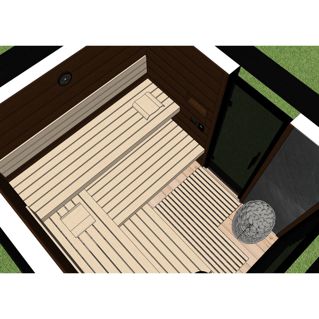 Im Inneren der Bjorn Sauna erwartet Sie eine Atmosphäre der Gemütlichkeit und Entspannung. Das Abachi-Thermoholz, das für die Innenverkleidung verwendet wurde, besticht durch seine dunkle Farbe, seine samtige Textur und sein einzigartiges Aroma. Dieses hochwertige Holz schafft ein behagliches Ambiente, in dem Sie vollkommen abschalten können.