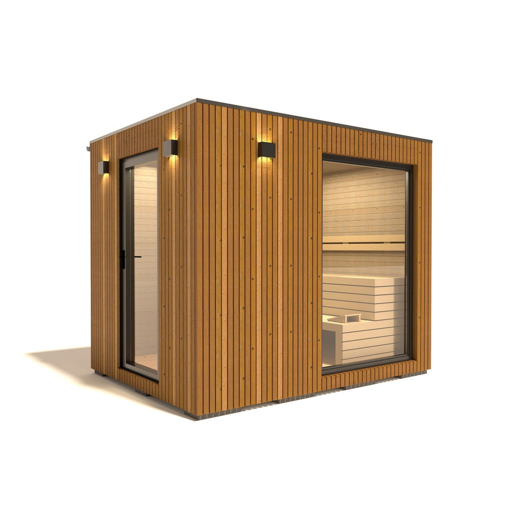 Die Fassade der Gartensauna Elsa besteht aus vertikalen Lamellen mit einem rechteckigen Profil, die mit einer Schutzimprägnierung in der vom Kunden gewählten Farbe gestrichen sind. Dadurch fügt sich die Sauna harmonisch in die Umgebung ein und verleiht dem Garten einen Hauch von Eleganz.
