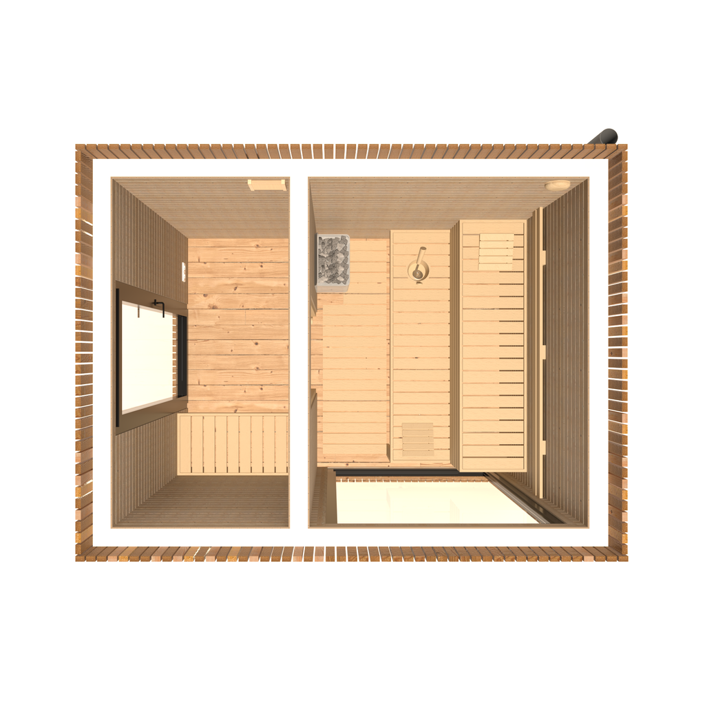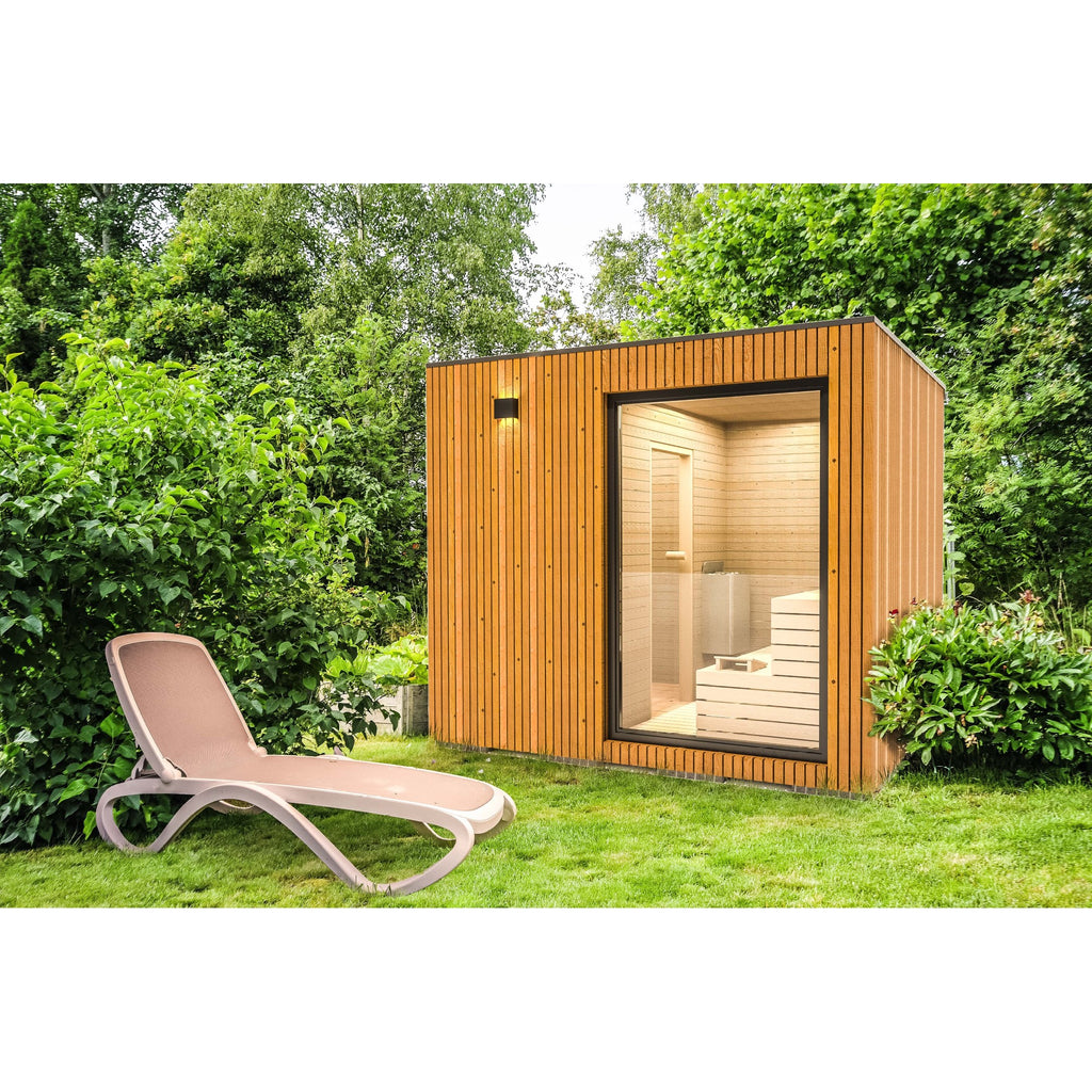 Ein besonderes Highlight der Gartensauna Elsa ist das 140 × 210 cm große Aluminiumfenster, das einen Blick ins Grüne ermöglicht und gleichzeitig für eine helle und luftige Atmosphäre im Saunaraum sorgt. Das Flachdach ist mit einer robusten PVC-Membran abgedeckt, die die Konstruktion zuverlässig vor Witterungseinflüssen schützt und eine lange Lebensdauer gewährleistet.