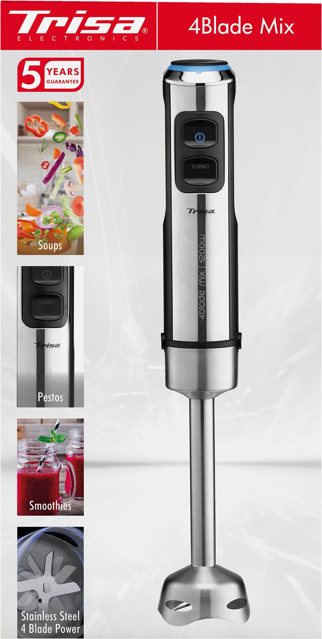 Selbst anspruchsvollste Küchenaufgaben meistert der Trisa Stabmixer "4Blade Mix» im Handumdrehen. Mit seinen widerstandsfähigen Edelstahl 4-Klingen Messer und dem kraftvollen 1200W Motor ist das Pürieren von Suppen, Saucen und anderen Gerichten jetzt kinderleicht. Die stufenlose Geschwindigkeitsregulierung und die Turbofunktion machen es möglich, genau die perfekte Konsistenz zu erreichen. Dank ergonomischem Griff ist die Bedienung einfach und unkompliziert, selbst einhändig. Das Gehäuse und derMixfuss bestehen aus hitzeresistentem Edelstahl und lassen sich problemlos reinigen. Mit dem praktischen Klicksystem montieren Sie den Mixfuss im Handumdrehen an oder ab. Eine stylische LED Aktivierungs- und Betriebsanzeige rundet das Design ab. Der "4Blade Mix» ist der ideale Küchenhelfer für jeden, der Wert auf Qualität und Leistung legt. Mühelos und kinderleicht erzielen Sie jetzt die perfekte Konsistenz in Ihren Gerichten.Widerstandsfähiges 4-Klingen-Messer aus Edelstahl und 1200 W-MotorStufenlose Geschwindigkeitsregulierung und TurbofunktionEinhändige Bedienung dank ergonomischem GriffGehäuse und Mixfuss aus hitzeresistentem Edelstahl zur rückstandslosen ReinigungPraktisches Klicksystem zum Anbringen und Abnehmen des MixfussesEntfernen Sie den Fuss des Mixers