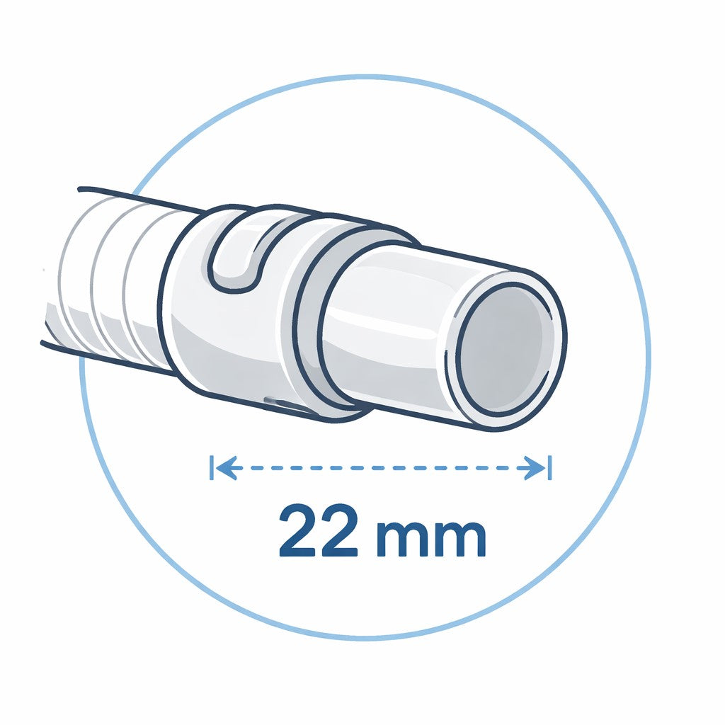• Schlauchanschluss 22 mm Durchmesser – kompatibel mit allen handelsüblichen CPAP-Geräten auf dem Markt